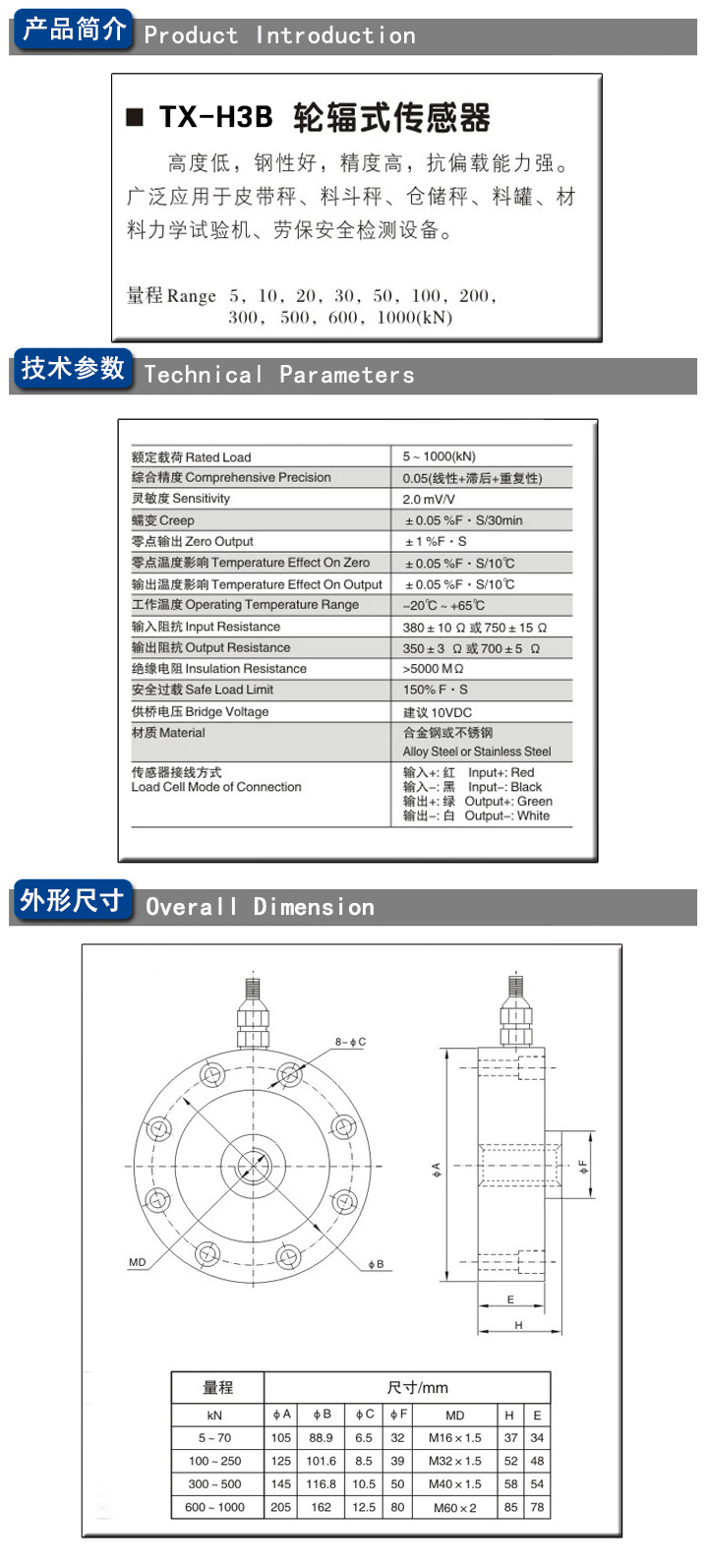 TX-H3B型轮幅式系列传感器采用十字剪切梁结构,具有良好的自然线性、抗偏载能力强、精度高、外形高度低、安装方便稳定,在料斗称、汽车衡、轨道衡等电子称中广泛应用,在各种工业称重系统中做力的分析与测量。可选择一体化标准信号输出,三线制,0~10mA、4~20mA或0~5V输出。