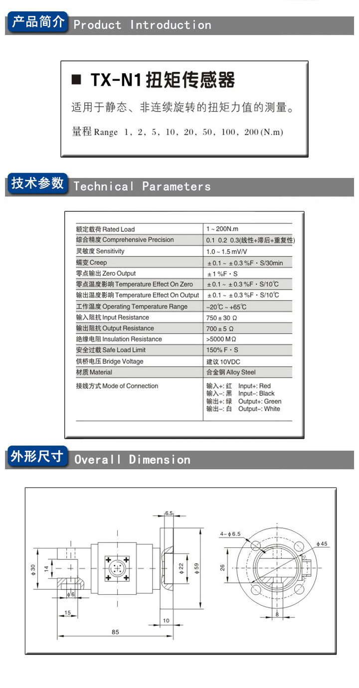 TX-N1静态扭矩传感器根据电阻应变原理把扭转力矩产生的应变转换成与其成线性关系的电信号,该产品制造工艺成熟,品种齐全,量程范围广,精度高,性能稳定可靠。广泛应用于试验机、静止扭矩检测等测试系统中,由于出色的稳定性、较高的测量精度和极高的性价比而受到用户的赞誉。