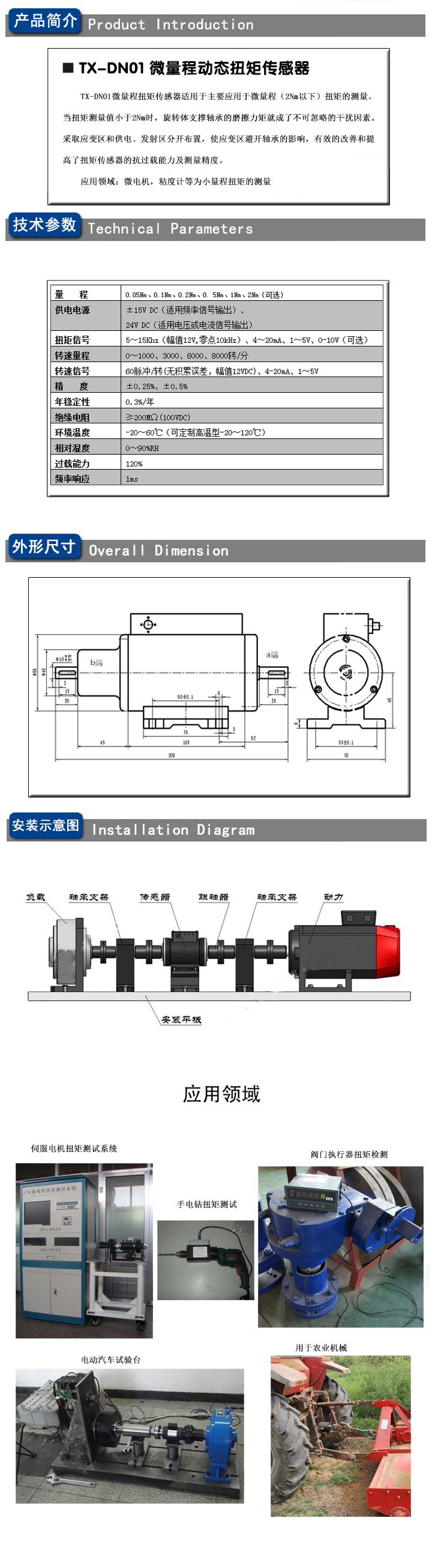 TX-DN01动态扭矩传感器是一种测量各种扭矩、转速及机械功率的精密测量仪器。应用范围十分广泛,主要用于: 1、电动机、发动机、内燃机等旋转动力设备输出扭矩及功率的检测; 2、风机、水泵、齿轮箱、扭力板手的扭矩及功率的检测; 3、铁路机车、汽车、拖拉机、飞机、船舶、矿山机械中的扭矩及功率的检测; 4、可用于污水处理系统中的扭矩及功率的检测; 5、可用于制造粘度计; 6、可用于过程工业和流程工业中。